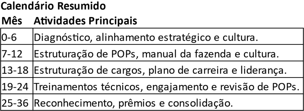 Essa estrutura completa garante a transformação gradual e sustentável da gestão e cultura da fazenda, engajando todos os colaboradores e promovendo um ambiente de trabalho mais eficiente, motivador e humanizado.